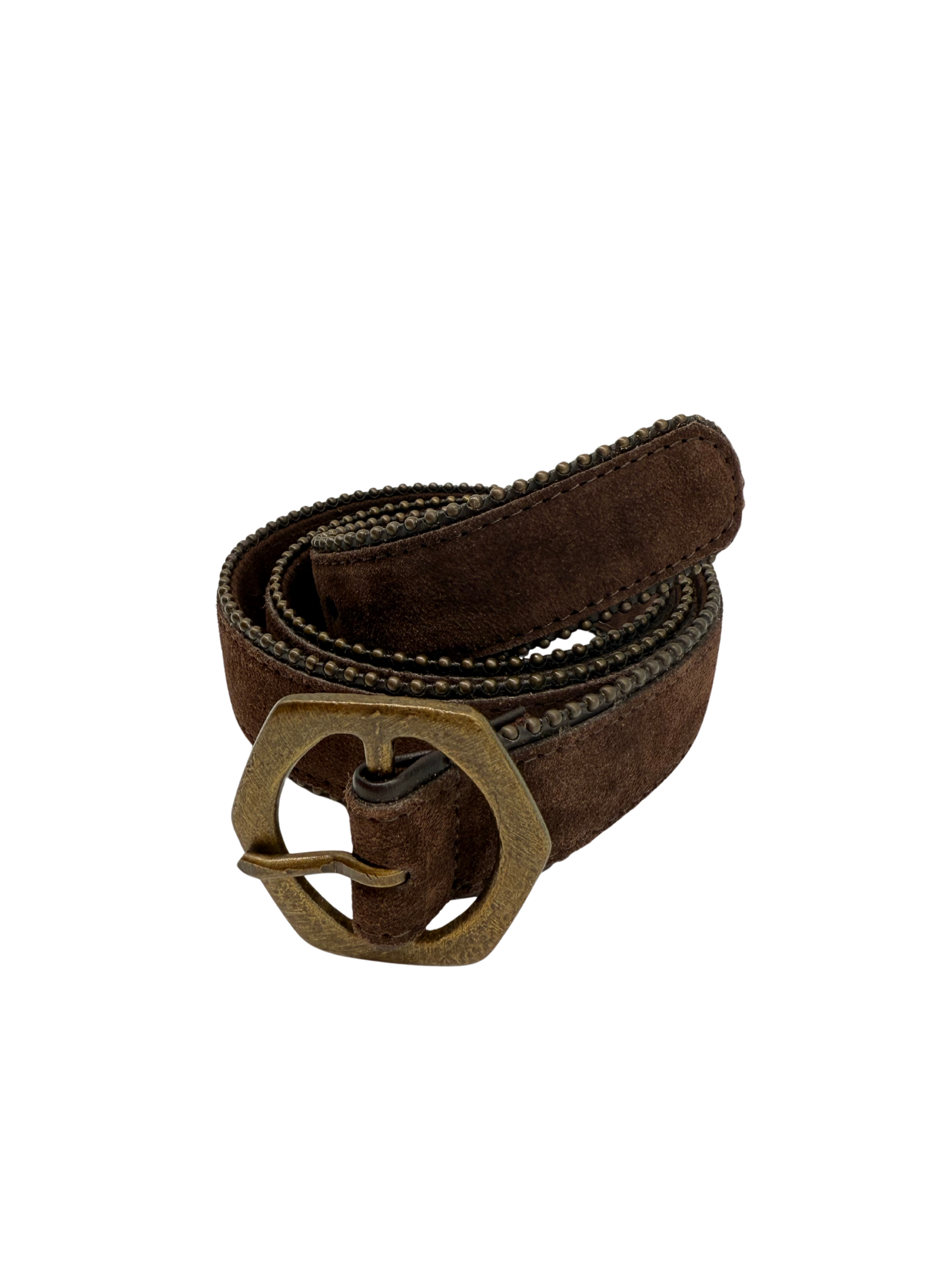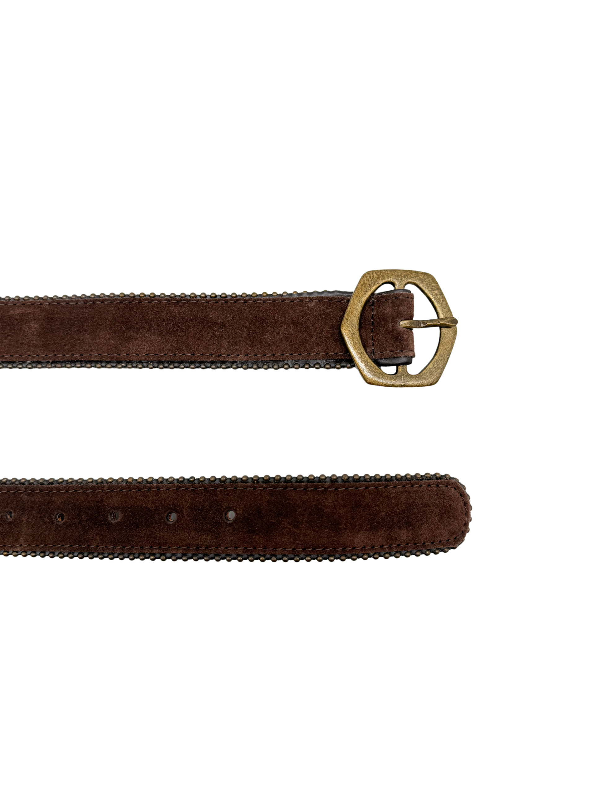 Cinturón de piel en color marrón oscuro. Hebilla en oro gastado al igual que el detalle de bolitas. Disponible en talla única.