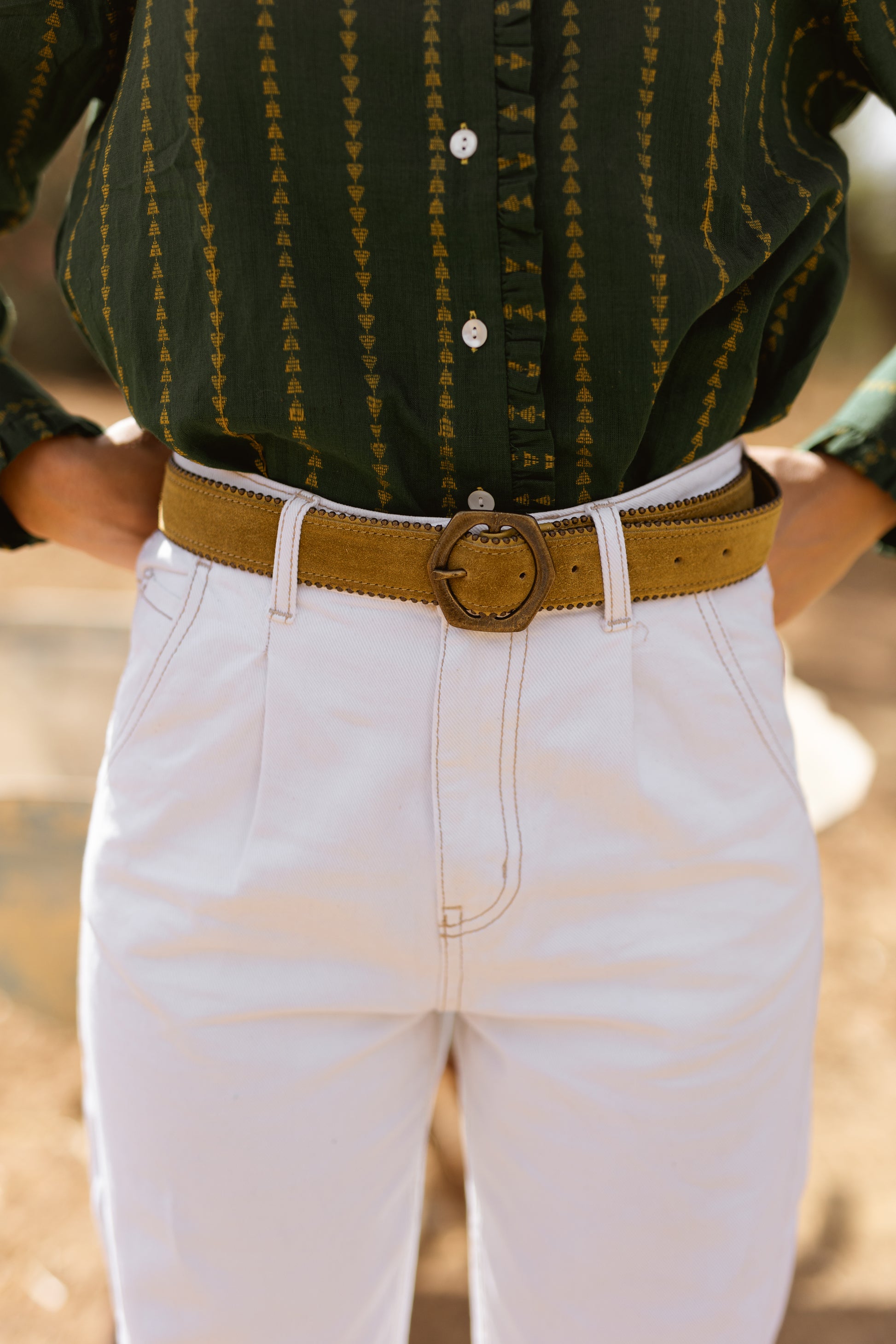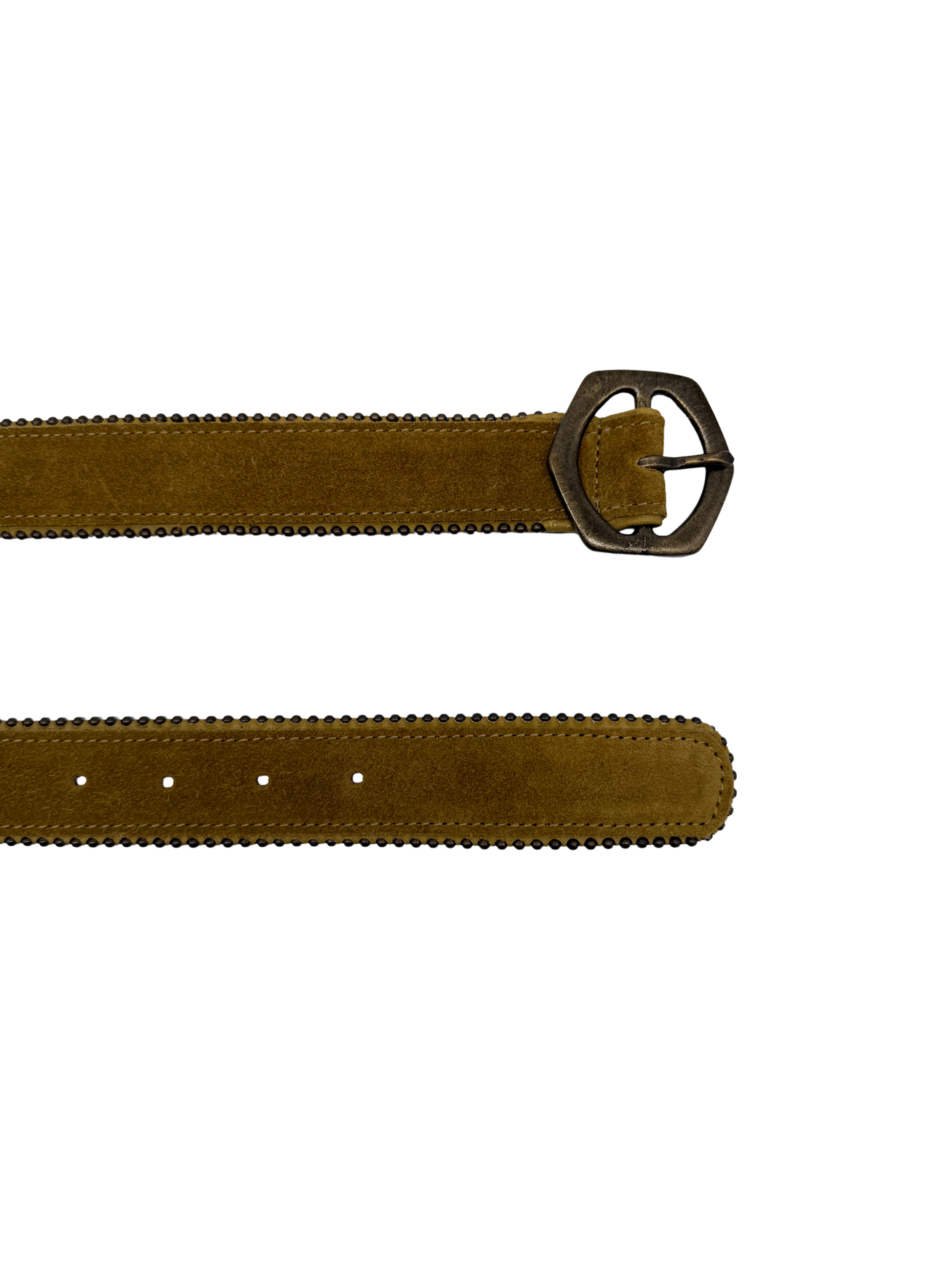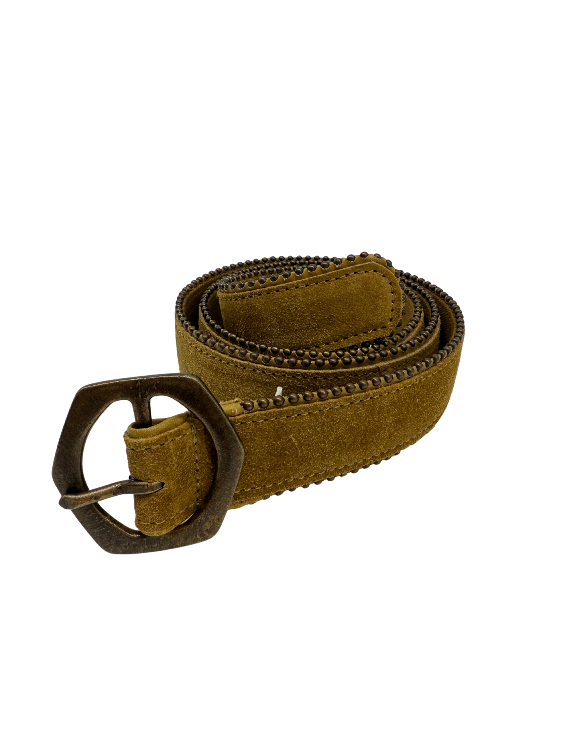 Cinturón de piel en color ocre. Hebilla en oro gastado al igual que el detalle de bolitas. Disponible en talla única.