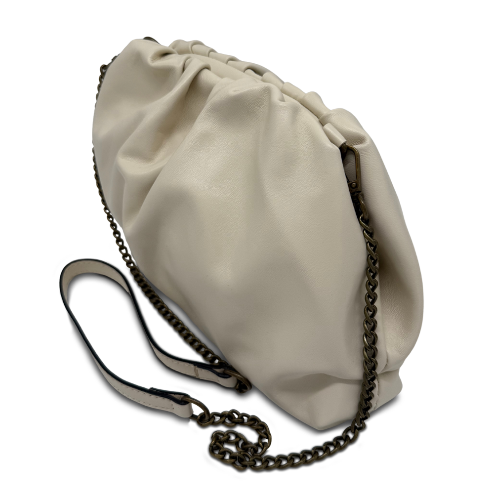 Bolso bandolera mediano realizado en piel de vacuno fruncida. Su correa metálica extraíble permite que puedas llevarlo como bolso de hombro o de mano.