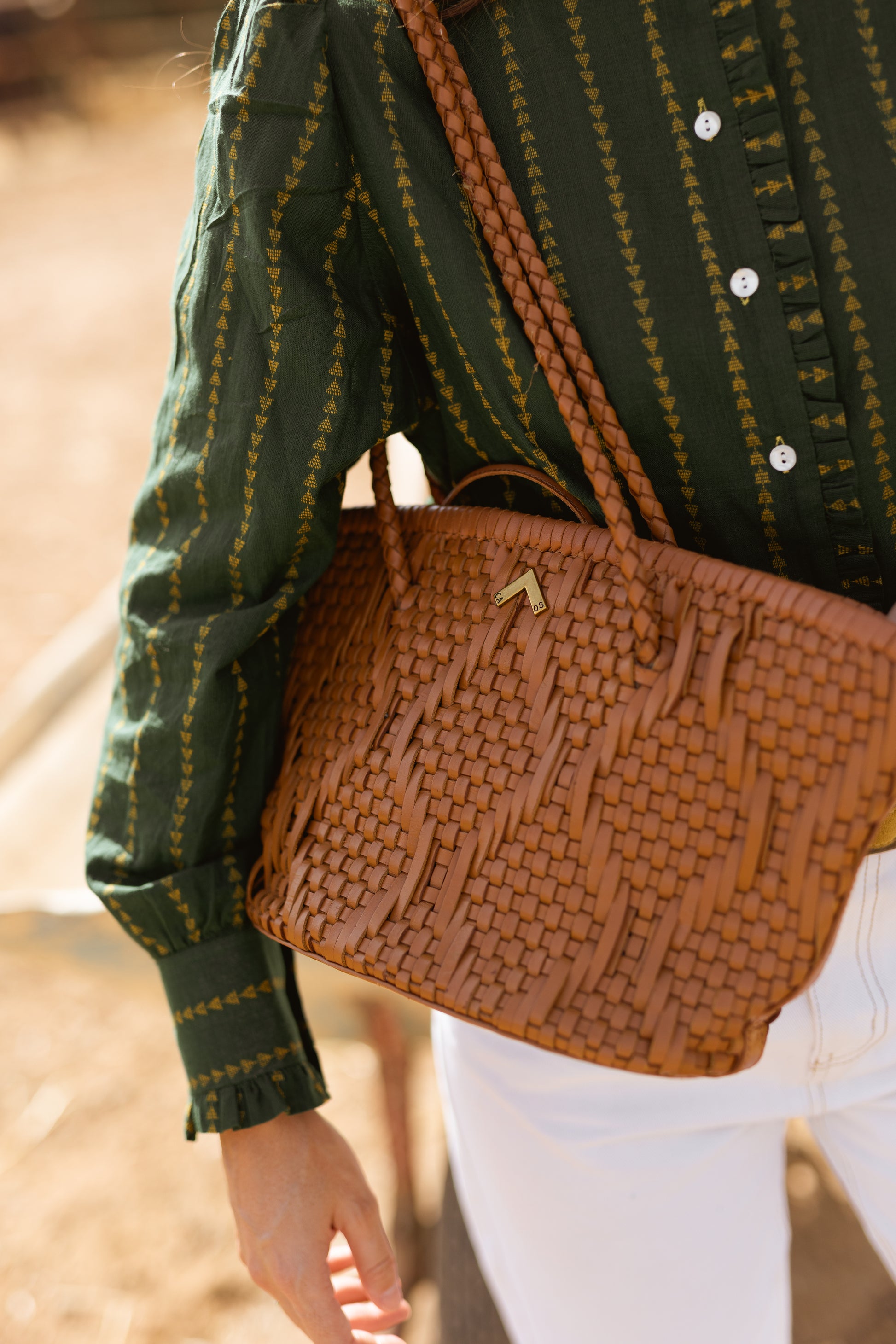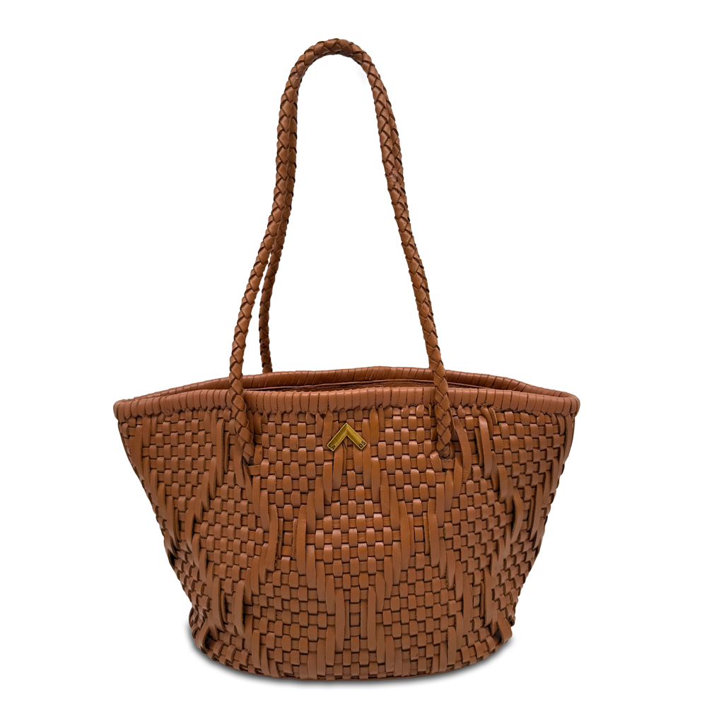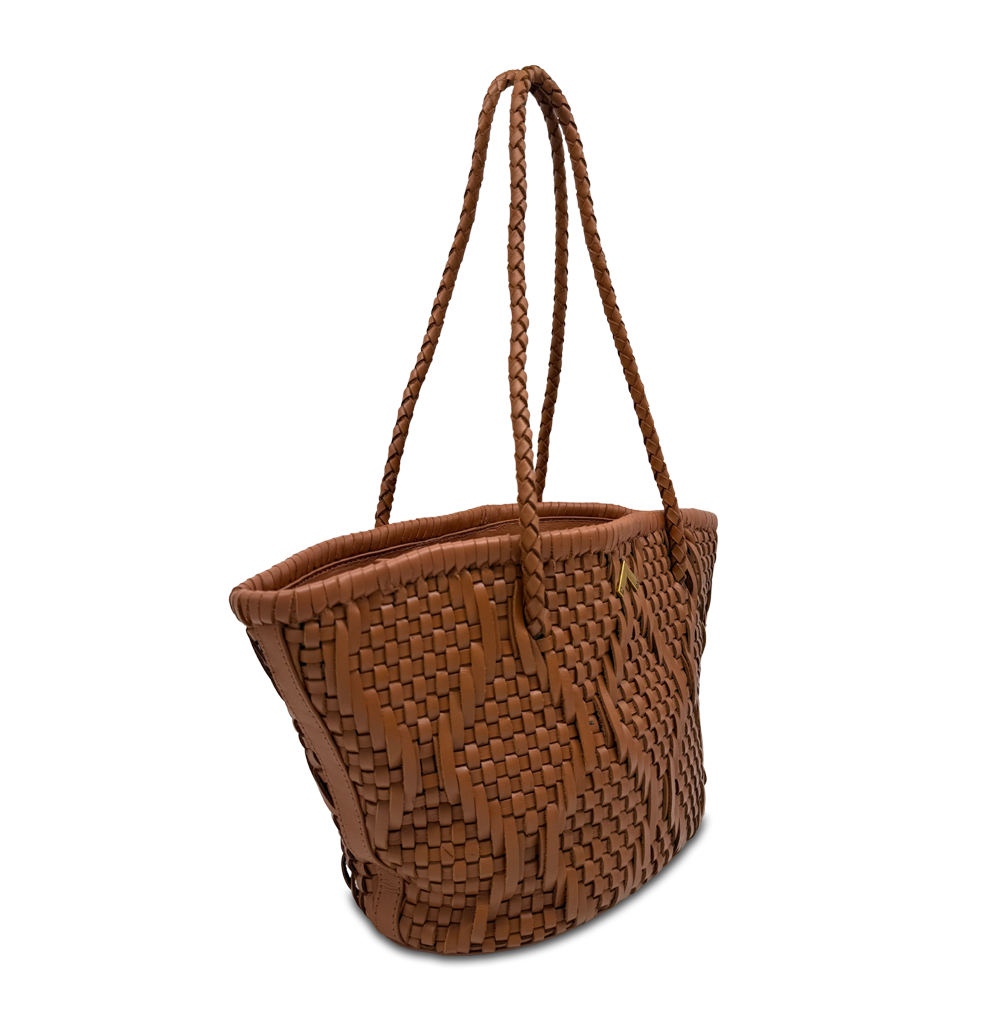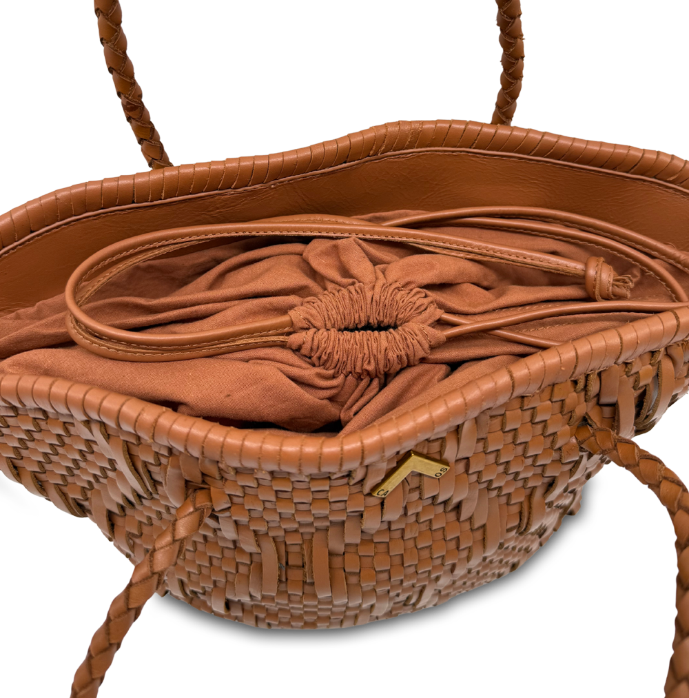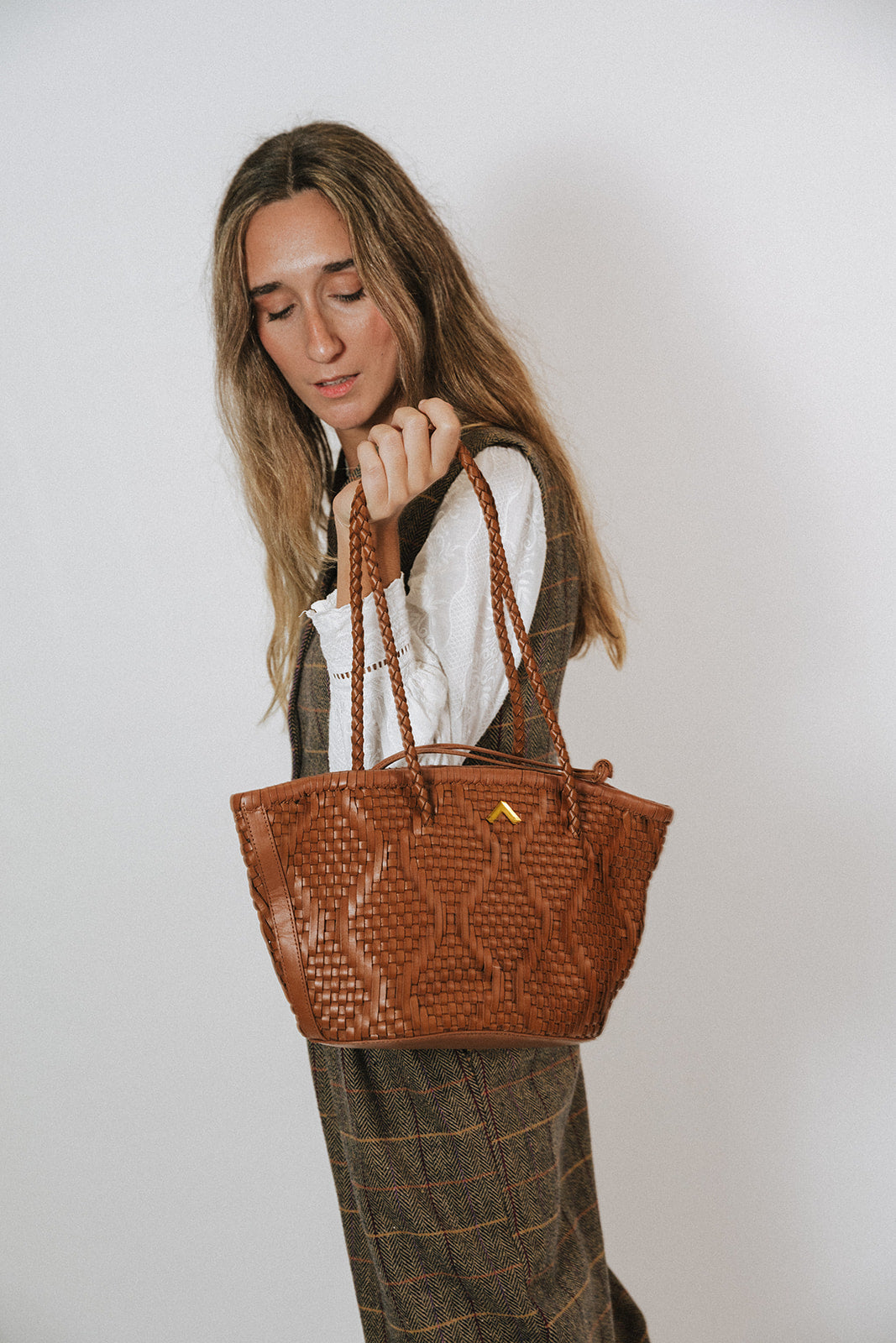 Bolso de hombro tipo cubo de piel trenzada con tamaño mediano. Su asa corta permite llevarlo con comodidad al hombro, agregando un toque moderno a tu estilo. Cierre con cordón para fruncir que asegura la protección de tus pertenencias.