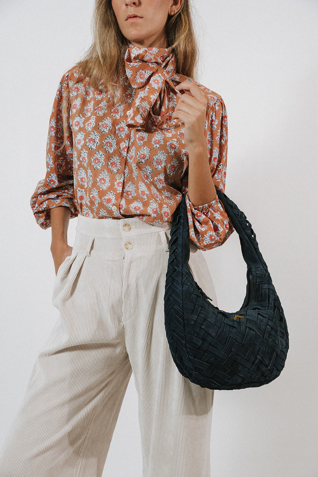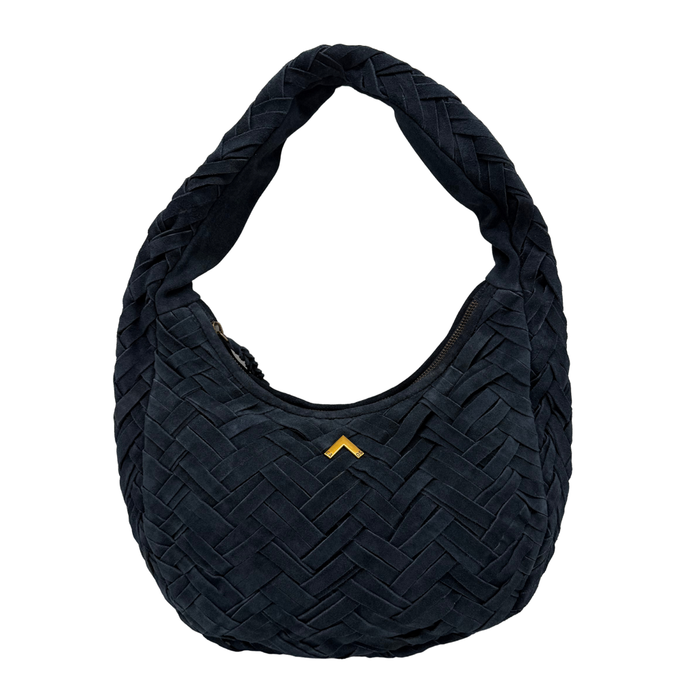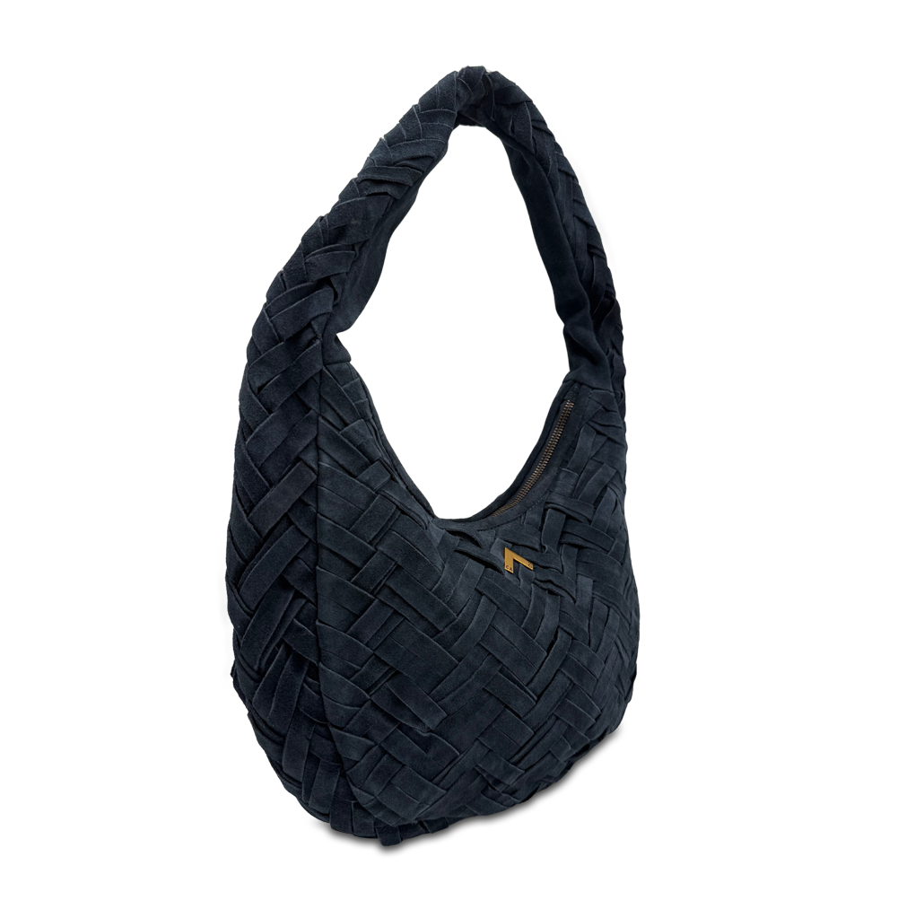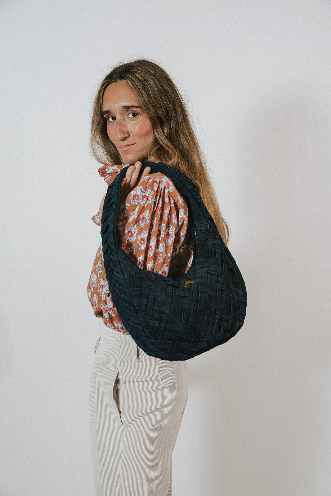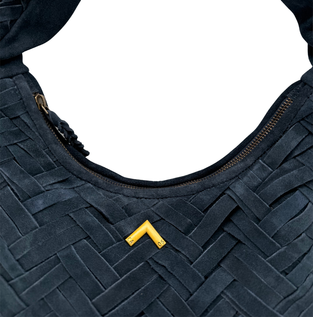 Bolso hobo de piel trenzada en ante con tamaño mediano. Su asa corta permite llevarlo con comodidad al hombro, agregando un toque moderno a tu estilo. El cierre con cremallera asegura la protección de tus pertenencias, mientras que el bolsillo interior ofrece espacio adicional para lo que necesites llevar. Cuenta con forro de algodón en el interior.