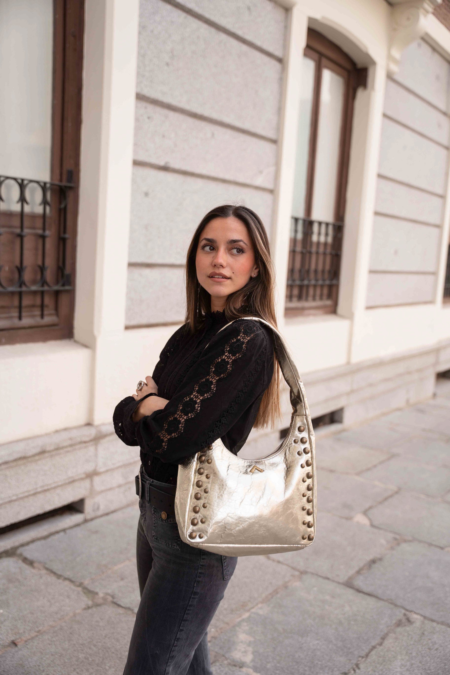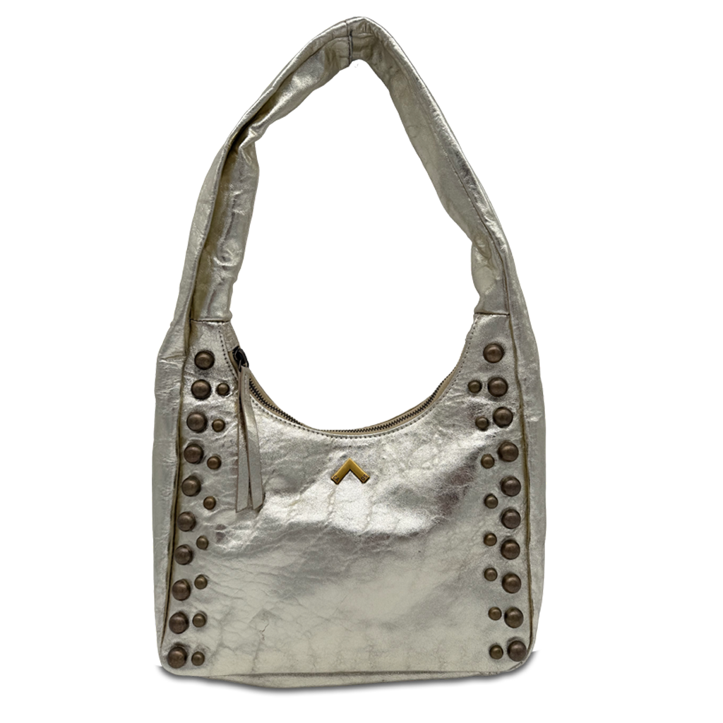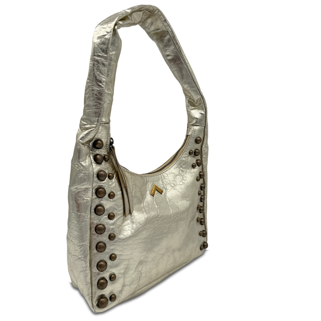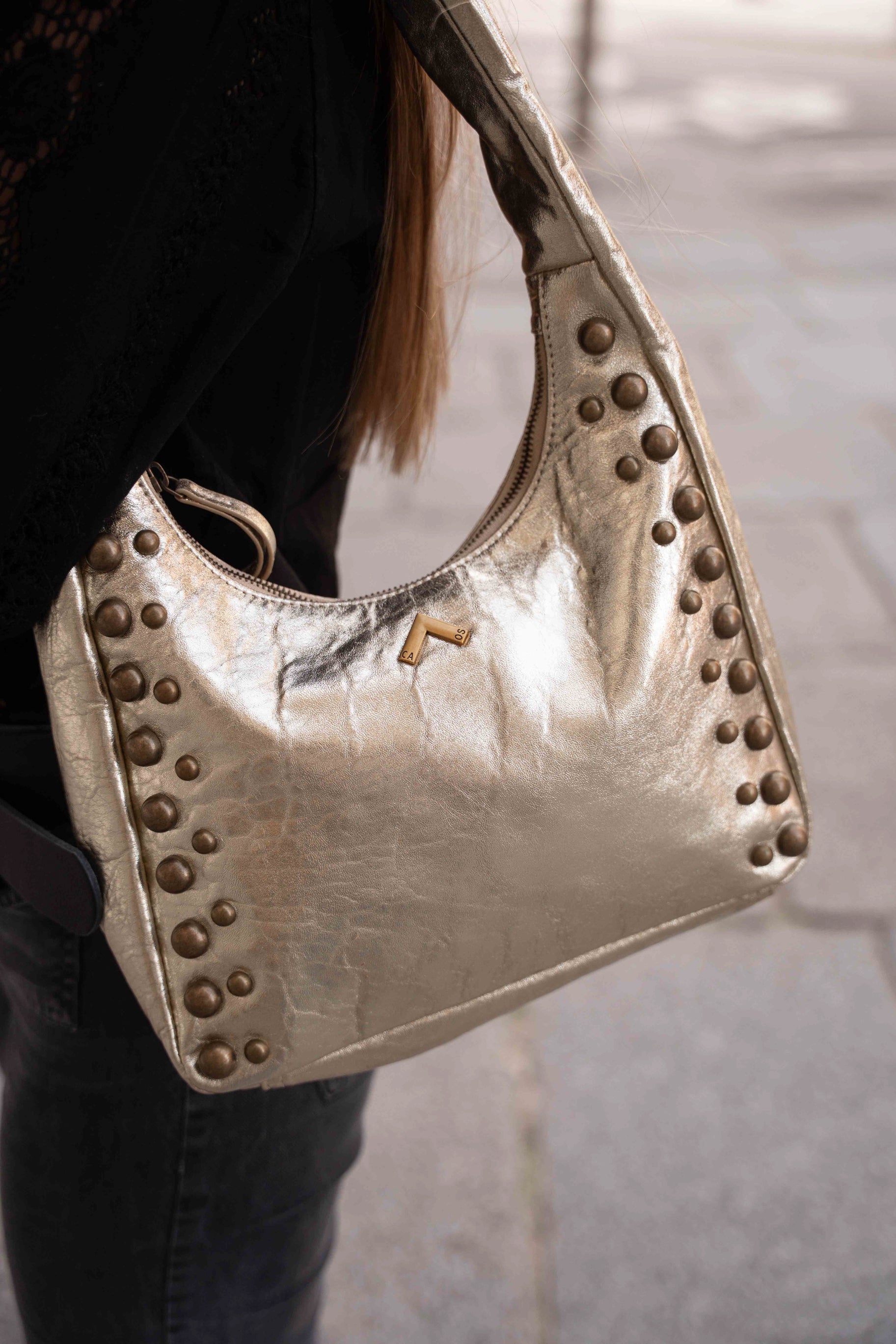Este bolso mediano de piel arrugada destaca por su diseño moderno y funcional. Su estructura espaciosa, con cierre de cremallera, te permite llevar todo lo que necesitas con total seguridad. Las asas de hombro garantizan comodidad, mientras que los detalles de tachuelas recorren su cuerpo, aportando un toque contemporáneo y sofisticado.