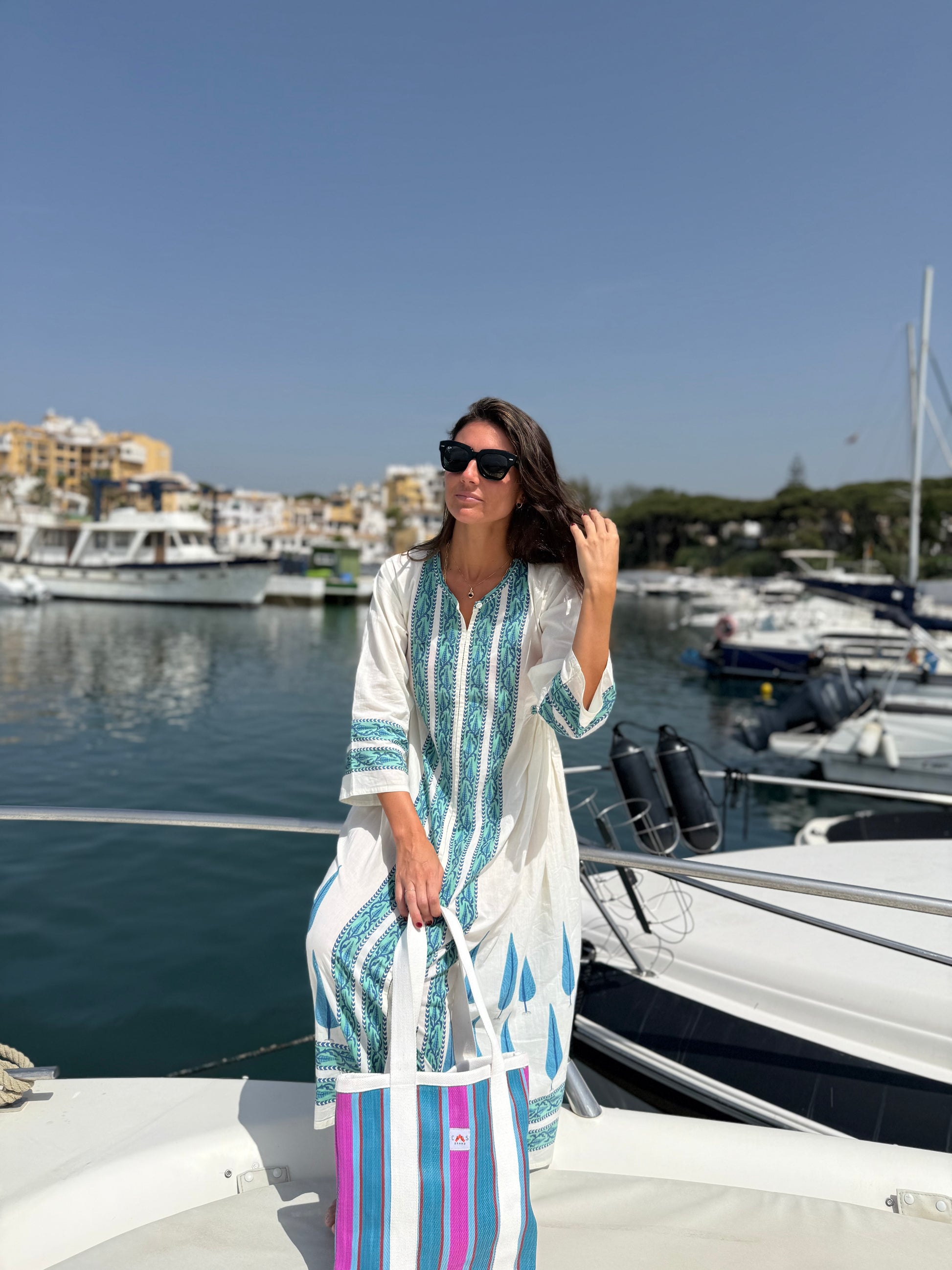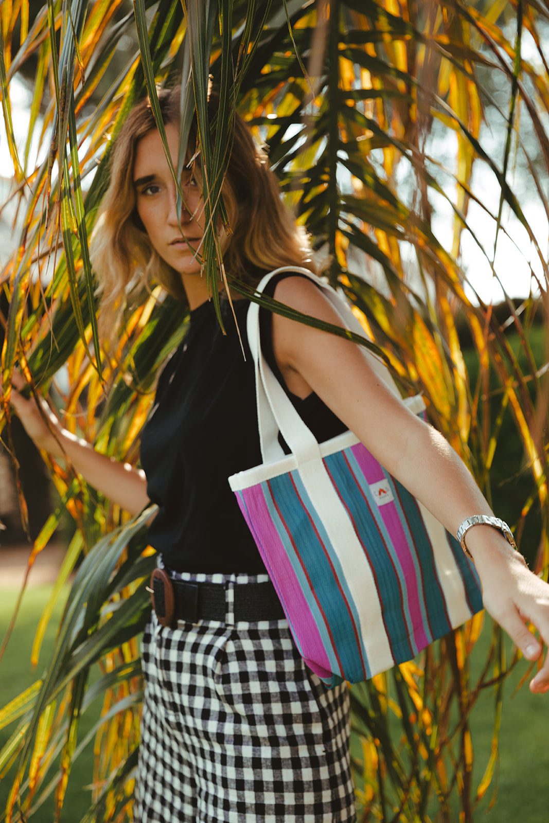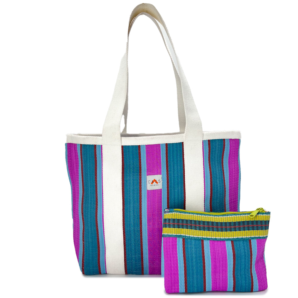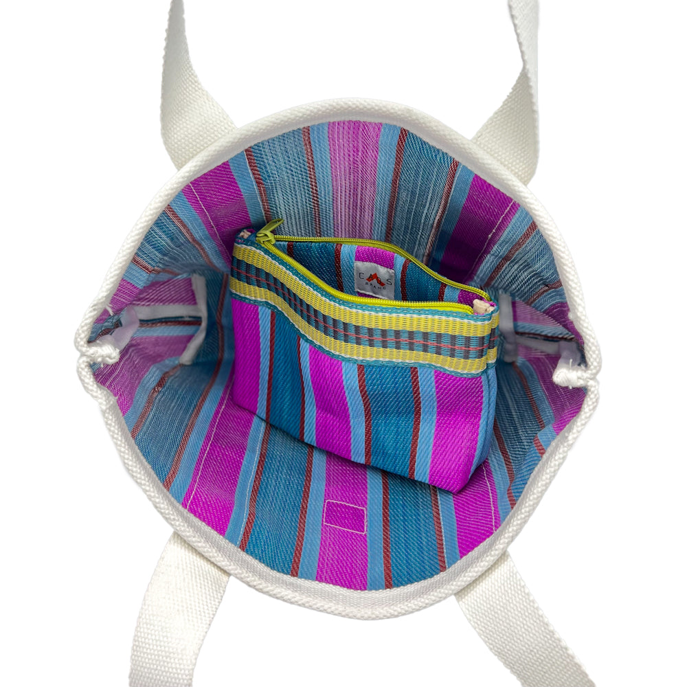 Synthetic beach bag with cotton handles to carry on the shoulder, matching small bag and wide opening without closure. Striped design in the Indian shopper bag style. This bag is made from recycled polypropylene bags used in India to transport cement. For this reason, variations in the fabric may occur and colors may transfer on some surfaces, but it is part of a unique design.